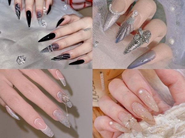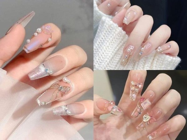 Mẫu nail đính charm nhẹ nhàng, sang trọng (Nguồn: Aquarius và mit housse nailroom) Bộ móng tay đẹp hơn khi được đính nhiều charm màu sắc (Nguồn: amp.voh.com.vn và _09thang7 – Pinterest)Nail phủ kim tuyến