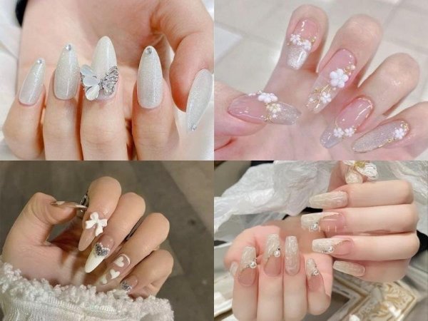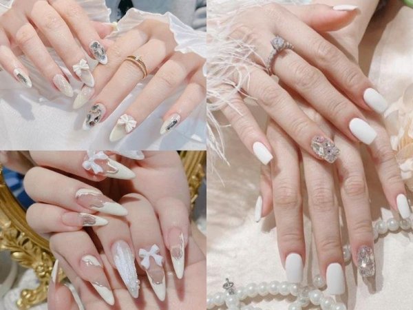 Mẫu nail trắng đơn giản nhưng không kém phần thu hút (Nguồn: Hồng Phượng, Moonnnnn_1712, Linzy – Pinterest) Để trở nên thật nổi bật, lộng lẫy, bạn có thể lựa chọn kiểu nail màu trắng đính đá hoặc phụ kiện có tông màu bạc (Nguồn: Noo, Ngân Trần, Linzy – Pinterest)Nail màu đỏ cuốn hút