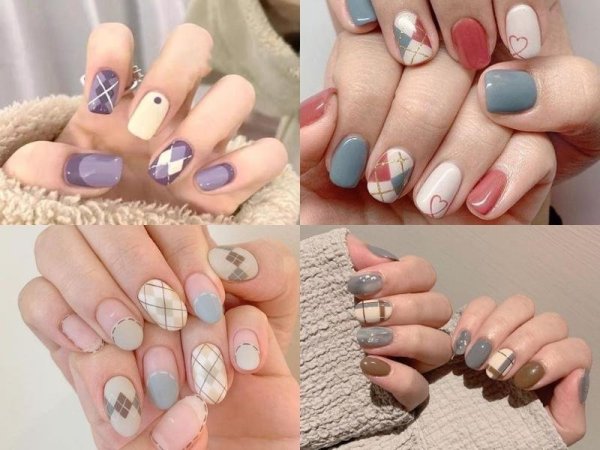 Nail kẻ caro đơn giản nhưng không kém phần thu hút (Nguồn: Ferdi, Jolie, Domynailart linktr.ee) Nail caro sành điệu, nhiều màu sắc (Nguồn: Nailogy, Hương Thái, Oanh Trần, Jolie – Pinterest)Mẫu móng tay họa tiết