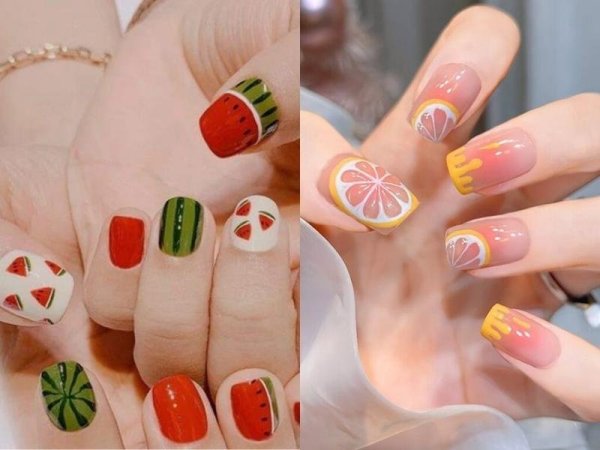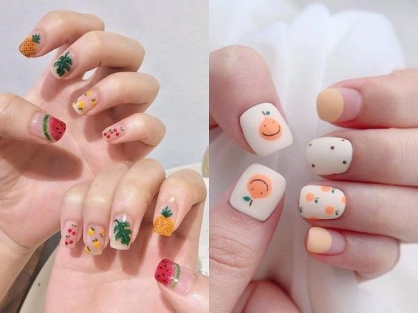 Với móng tay ngắn đến tầm trung, kiểu nail hoạ tiết trái cây đáng yêu sẽ tạo nên một vẻ ngoài vui tươi và trẻ trung. Bạn có thể chọn các hoạ tiết thịnh hành như dâu tây, chuối, cam, hoặc kiwi,… và thử kết hợp những họa tiết này trên bộ móng của bạn. Màu sắc tươi sáng và các chi tiết nhỏ của mẫu nail này sẽ làm cho móng tay nổi bật và thu hút hơn.