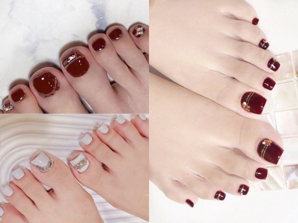 Ngoài ra, bạn có thể kết hợp thêm kiểu hoa văn, họa tiết hay đính charm tùy sở thích. Mẫu nail chân đính đá này cũng khá phù hợp cho những trang phục dự tiệc đơn giản hay những sự kiện nhỏ ấm cúng.