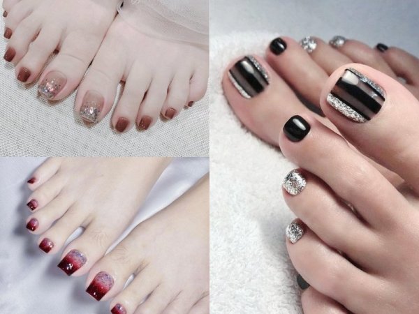 Mẫu móng chân đẹp đơn giản đính kim tuyến rực rỡ, nổi bật và lấp lánh (Nguồn: himson – Pinterest, Jonestrantranxxi – Pinterest, fs388168 – Pinterest) Nail kim tuyến đơn giản, không quá cầu kỳ với những màu sắc cơ bản như đen, đỏ, nâu (Nguồn: Nail Croom – Pinterest, Như Ý Nguyễn – Pinterest, beaudy.vn)Mẫu nail chân tráng gương đơn giản