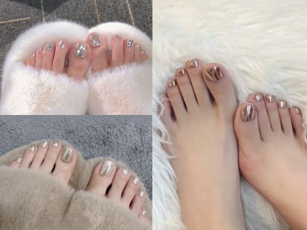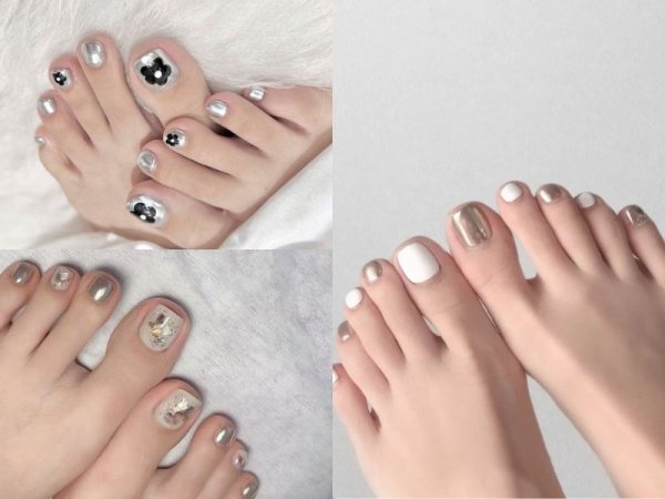 Mẫu nail chân đơn giản sang trọng tráng gương với lớp phủ bóng như gương và phản xạ ánh sáng giúp làm nổi bật bàn chân (Nguồn: trananh1312 – Pinterest, Mit’s House – Pinterest, Dilys_Chilly – Pinterest) Mẫu nail tráng gương đơn giản nhưng giúp bàn chân thon, dài hơn (Nguồn: Seoul Academy – Pinterest, Làm Đẹp Mỗi Ngày – Pinterest)Mẫu nail chân đơn giản vẽ hoa