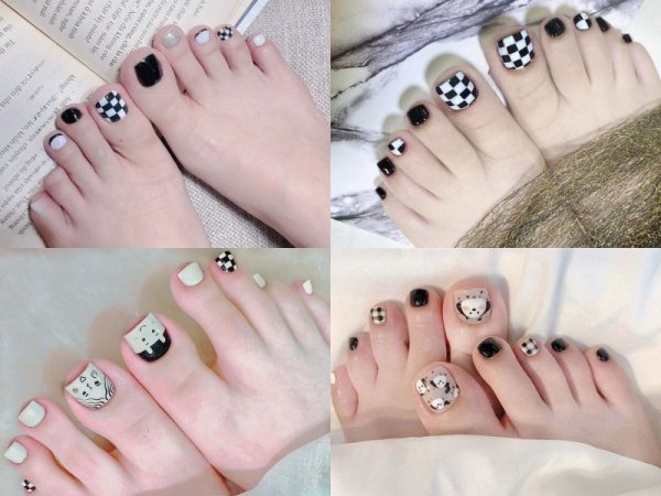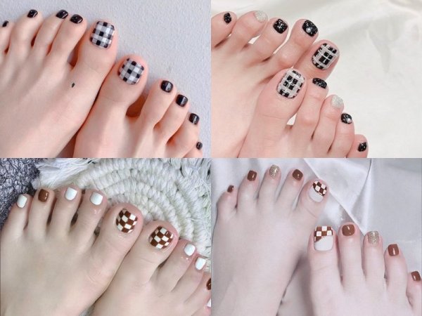 Mẫu nail chân kẻ ô đơn giản nhưng không kém phần tinh tế, phong cách (Nguồn: NailUyenChi – Pinterest, trananh1312 – Pinterest, Tây Tuyết Beauty – Pinterest, Ruby Nail – Pinterest) Kiểu móng chân đơn giản đẹp này là sự phối hợp giữa những gam màu tương phản như trắng và đen (Nguồn: Học viện Milian – Pinterest, Vanh Nail – Pinterest, Laville Nail – Pinterest)> Xem thêm: 20+ những mẫu nail đẹp cho móng ngắn nhẹ nhàng