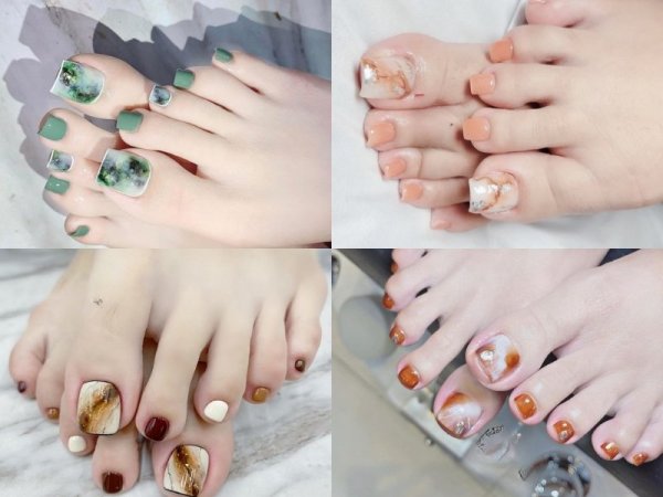 Nail chân họa tiết vân đá sơn màu tối sang trọng và cuốn hút với hiệu ứng loang độc đáo (Nguồn: CLAUDIA – Pinterest, Linh Tây Nail – Pinterest, Trần Hà Nail – Pinterest, Nail Vấn Beauty – Pinterest) Kiểu nail chân đơn giản sang trọng vân đá sơn màu sáng lại có phần nhẹ nhàng, nữ tính hơn (Nguồn: Hà Thương – Pinterest, Thư Nail – Pinterest, warm nail studio – Pinterest)Mẫu nail chân đơn giản họa tiết con vật hoạt hình