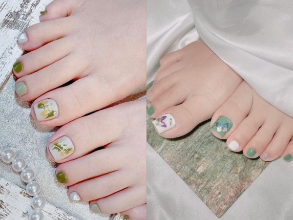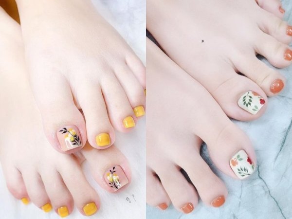 Sự kết hợp giữa họa tiết hoa và lá sẽ giúp bộ nail chân thêm tự nhiên và sống động. Những họa tiết hoa lá với màu sắc tương phản cùng nét vẽ tinh tế, tỉ mỉ mang lại vẻ đẹp nhẹ nhàng, nữ tính nhưng không kém phần cuốn hút. Tuy đơn giản nhưng kiểu nail này có tính ứng dụng cao, phù hợp với cả phong cách trẻ trung, ngọt ngào cho đến phong cách thanh lịch, nữ tính.