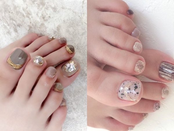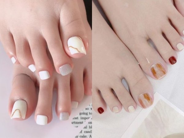 Đây là một mẫu nail chân mang lại vẻ đẹp sang trọng và cuốn hút. Mẫu nail này tạo nên hiệu ứng đá quý lộng lẫy và tinh tế, rất phù hợp với những kiểu trang phục trưởng thành, quyến rũ. Bạn có thể lựa chọn những màu sơn tối như đen, xám, xanh da trời để thêm huyền bí, quý phái hơn, hoặc những màu sơn sáng như hồng, xanh ngọc để nữ tính hơn. Những đường vân đá loang mờ nhạt vô cùng sống động kết hợp kẻ viền, đính đá nhỏ đơn giản sẽ giúp bộ nail thêm nổi bật nhưng vẫn có tính ứng dụng cao.