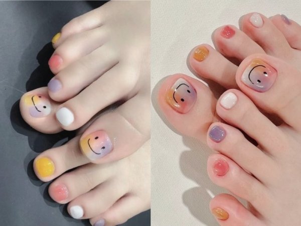Bạn có thể tạo ra màu sắc cá tính riêng bằng cách sơn các màu so le lên bộ móng chân theo ý thích. Mẫu nail chân đơn giản nhẹ nhàng nhiều màu tuy chỉ sơn trơn đơn giản nhưng cực kỳ nổi bật và ấn tượng với phong cách riêng của bạn. Bạn có thể kết hợp từ khoảng 2-4 màu có độ tương phản nhẹ với sắc độ cơ bản. Kiểu nail này sẽ tạo nên phong cách đầy màu sắc cho tổng thể trang phục của bạn.
