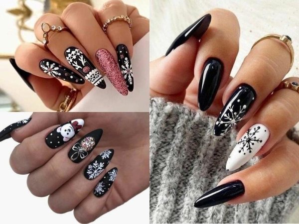 Một mẫu nail Noel đẹp với màu đen chủ đạo chắc chắn sẽ dễ dàng giúp chị em tạo được ấn tượng với mọi người. Sự kết hợp giữa nền đen với bông tuyết trắng dù tương phản nhưng lại tạo nên hiệu ứng vô cùng nổi bật. Bộ móng này sẽ giúp bàn tay nàng được sang trọng, đẹp đầy huyền bí.