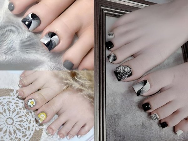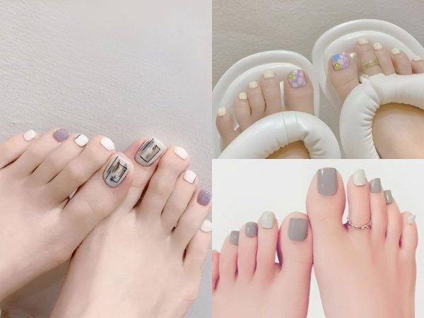Màu sơn móng chân đơn giản với tone xám thanh lịch (Nguồn: Hằng Nail, Caycream, Mỹ Anh Nails) Màu móng chân tôn da cực tốt với sắc xám hiện đại (Nguồn: Hani House, 1991 Nails, Bình Beauty)Mẫu sơn móng chân màu vàng nhạt