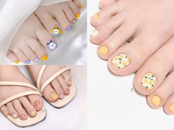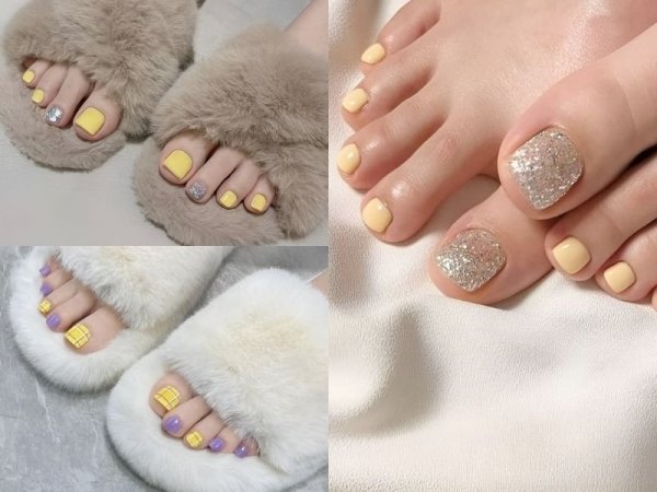 Màu sơn gel móng chân đẹp tone vàng tươi trẻ (Nguồn: Thu Trang, Maychao, Dreamy Nail) Mẫu sơn móng chân đẹp và sành điệu với tone vàng cá tính (Nguồn: Nail Diệp, Rurb6400s, Letty Beauty)Mẫu sơn móng chân trắng mix đen