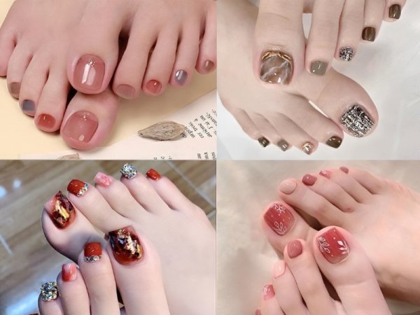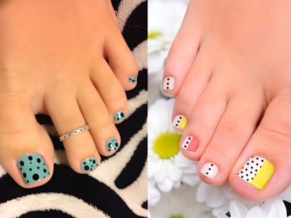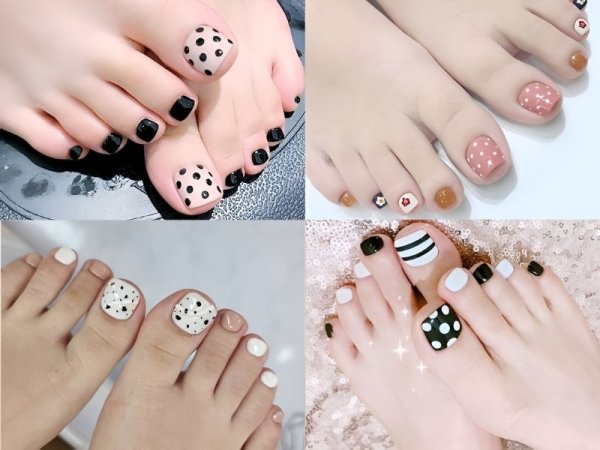 Xen kẽ các màu sắc và thêm họa tiết giúp bộ móng sinh động hơn (Nguồn: nora.onail, @thanhquynh5838- Pinterest, thetrendspotter, @GoodNail01- Pinterest) Mẫu vẽ móng chân nhiều màu tôn da hiệu quả (Nguồn: @nthuynh1204 – Pinterest, @nthuynh1204 – Pinterest)Mẫu móng chân cute chấm bi