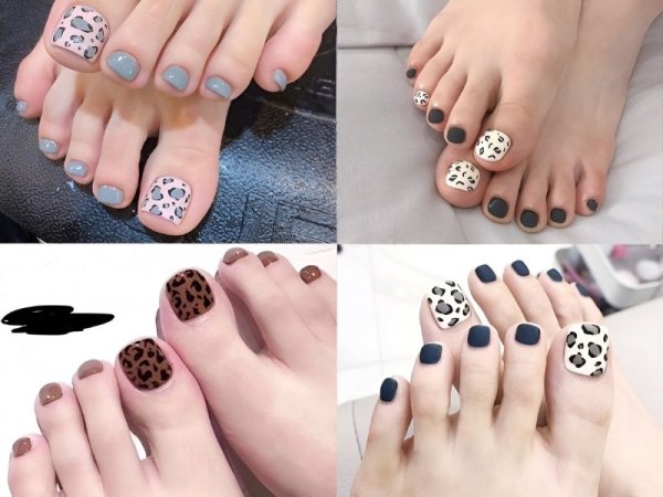 Mẫu vẽ móng chân da báo dành cho các cô gái cá tính, phóng khoáng (Nguồn: etsy.com, shopee.vn, Seoul Academy) Họa tiết da báo thích hợp với mọi dịp, từ tiệc tùng đến dạo phố (Nguồn: us.shein.com, coedo)Mẫu vẽ móng chân họa tiết đơn giản đính đá sang trọng