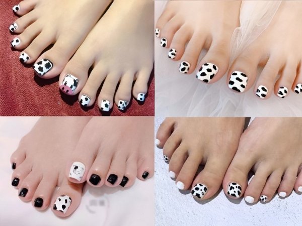 Con bò sữa là mẫu vẽ móng chân hot trend (Nguồn:nail-moca.jp, kemnailsieuben.com, hocnghenail, baoduyenbabyhouse)Mẫu vẽ hoa móng chân đẹp
