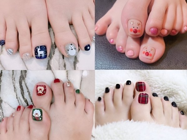 Mẫu móng chân Noel phù hợp với dịp lễ hội cuối năm (Nguồn:@lannguyen290393 – Pinterest, @clenguyen14 – Pinterest) Phối màu xanh đỏ, sử dụng các linh vật của Noel để trang trí móng của bạn (Nguồn:The Palm, enail.vn, m.shein.com.vn)Mẫu móng chân cute hình con vật