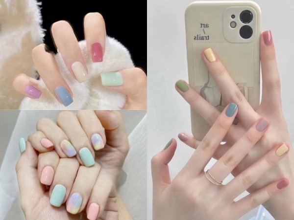 Một kiểu nail trơn cơ bản dành cho các bạn học sinh cực kỳ độc đáo, cá tính và mang phong cách riêng chính là kiểu sơn gel nhiều màu trên cùng một bàn tay. Để phù hợp với lứa tuổi, bạn nên chọn kết hợp từ những tông pastel nhẹ nhàng, xinh xắn như hồng, xanh, nâu, tím,… vô cùng đáng yêu và ngọt ngào nhé. Chọn từ khoảng 3-5 màu để kết hợp tạo nên bộ nail yêu thích của riêng bạn!