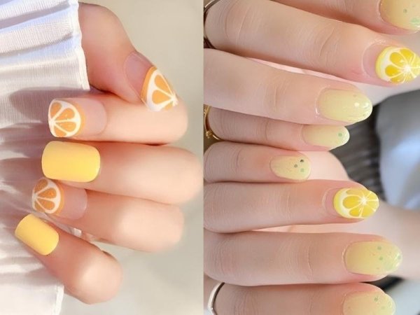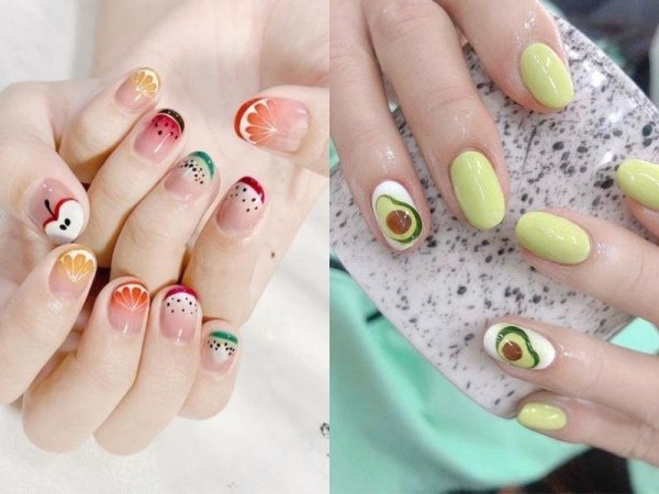 Kiểu họa tiết trái cây ngộ nghĩnh với hình chanh, dâu, cam, dưa hấu rực rỡ này sẽ giúp các bạn học sinh thêm đáng yêu, trẻ trung. Bạn có thể chọn những các gam màu sơn tươi sáng như vàng, xanh lá cây, đỏ, cam,… để giúp bộ nail thêm sống động. Những họa tiết này rất phù hợp cho mùa hè đó.