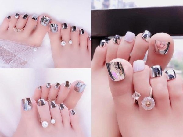 Màu tráng gương kết hợp với các món trang sức sẽ giúp chân nàng thu hút hơn (Nguồn: myphamxuanhanh.com, beecost.vn) Màu nail chân đẹp tôn da cho da ngăm (Nguồn: enail.vn, Dilys, amdepmoingay.com.vn)Sơn móng chân mix nhiều màu