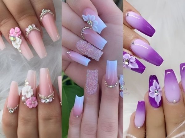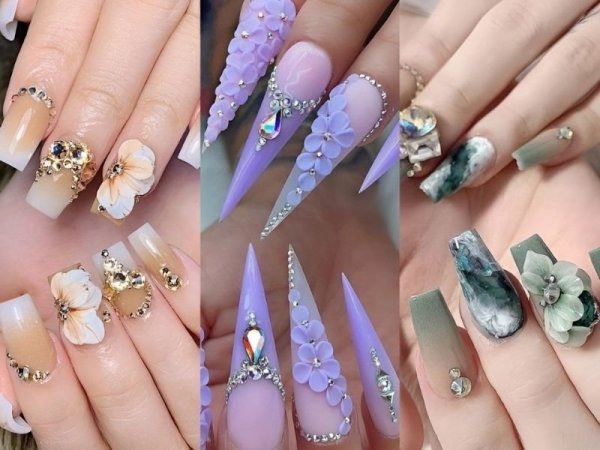 Những mẫu nail ombre kết hợp đắp bột 3D cầu kỳ, đẹp mắt (Nguồn: Hà Phương Nails Spa, Fashion Jackson, Nails Designs) Mẫu đắp bột ombre sang trọng, quyến rũ (Nguồn: Alayzia’s daily designs, etsy.com, Hà Phương Nails Spa)Mẫu nail ombre đính đá sang trọng
