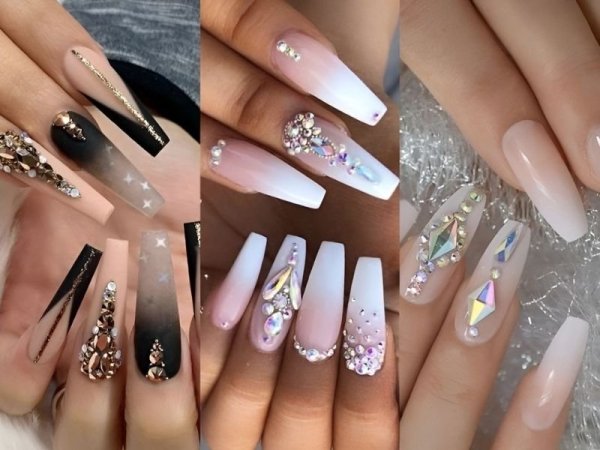 Mẫu nail ombre kết hợp đính đá cầu kỳ, đẹp mắt (Nguồn: mybeautysite.com, luxefair.com, Ngọc Anh Nails) Những mẫu nail ombre đính đá cho cô nàng sang chảnh (Nguồn: Shannon Grace, thegraydetails.com, glaminati.com)Mẫu nail ombre tông đỏ nổi bật
