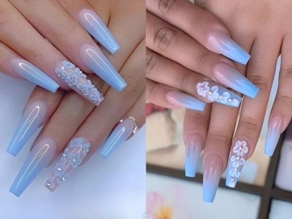 Nail ombre kết hợp đắp bột nổi 3D cũng là mẫu nail được đông đảo các chị em ưa chuộng. Những họa tiết hoa lá cầu kỳ được tạo hình sống động trên nền sơn loang màu tạo nên tổng thể bắt mắt hơn bao giờ hết. Đối với kiểu nail này, bạn nên lựa chọn dáng móng dài để có đủ diện tích trang trí các phụ kiện, đồng thời thấy được hiệu ứng ombre một cách rõ nét nhất.