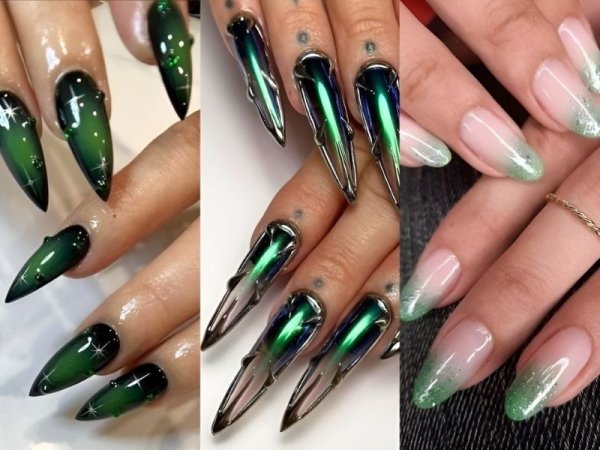 Nail ombre tông màu xanh lá là mẫu nail nổi bật mà bạn không nên bỏ qua. Sắc xanh lá có thể phối loang với nhiều tông màu đa dạng như: trắng, đen, nude, xanh dương,… Để tổng thể trở nên bắt mắt hơn, bạn có thể kết hợp vẽ họa tiết, phối ánh nhũ vàng, bạc hoặc đính kết nhiều phụ kiện, charm móng lấp lánh, cầu kỳ.