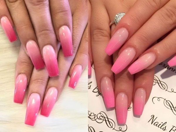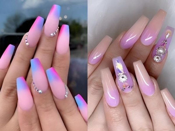 Nếu bạn là cô nàng theo đuổi phong cách ngọt ngào, nữ tính thì không nên bỏ qua mẫu nail ombre màu hồng. Chỉ cần phối loang màu hồng với những màu đơn giản như trắng hoặc nude là đã đủ để tạo nên tổng thể đơn giản nhưng đẹp mắt. Ngoài ra, bạn cũng có thể phối sơn ombre hồng với ánh tím hoặc xanh nhạt, kết hợp đính thêm đá để bộ nail trở nên long lanh và nổi bật hơn.