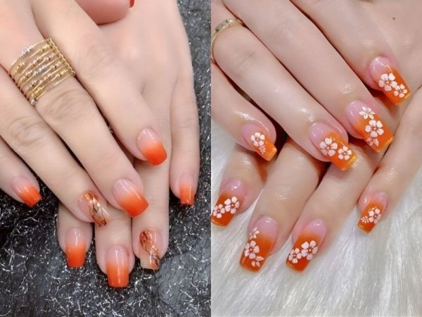 Nếu bạn đang tìm kiếm một mẫu nail nổi bật, ấn tượng thì không nên bỏ qua nail ombre tông cam. Sắc cam rực rỡ có độ chuyển màu tự nhiên khi phối hợp cùng vẽ họa tiết hoặc ánh kim tuyến lấp lánh sẽ tạo nên tổng thể vô cùng cuốn hút.
