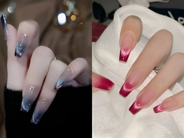 Bằng việc sử dụng loại sơn móng tay đặc biệt có chứa các hạt kim loại siêu nhỏ, người thợ sẽ dùng một thanh nam châm để di chuyển chúng tạo nên độ chuyển màu cùng hiệu ứng vệt sáng mắt mèo lấp lánh. Kiểu nail này mang đến cho bạn sự sang trọng, hiện đại, phù hợp với những cô nàng yêu thích phong cách nổi bật, sành điệu. Bạn có thể tham khảo một số cách phối màu trong nail ombre mắt mèo như: đen phối trắng, đen phối xanh, xám phối hồng,…