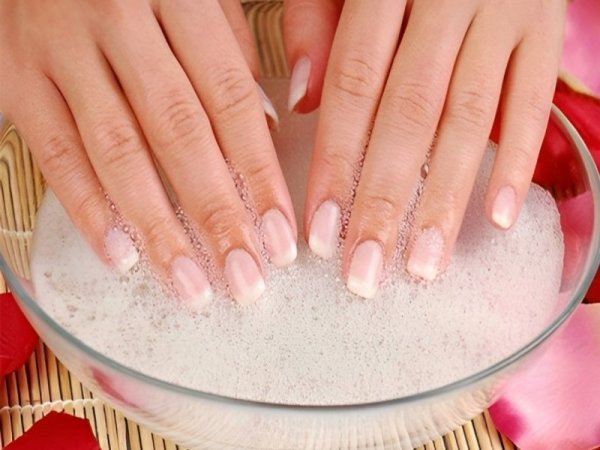 Ngâm móng tay vào nước ấm và xà phòng có thể làm mềm keo dán móng một cách dễ dàng (Nguồn: Enail)Móng tay giả sử dụng được trong bao lâu?