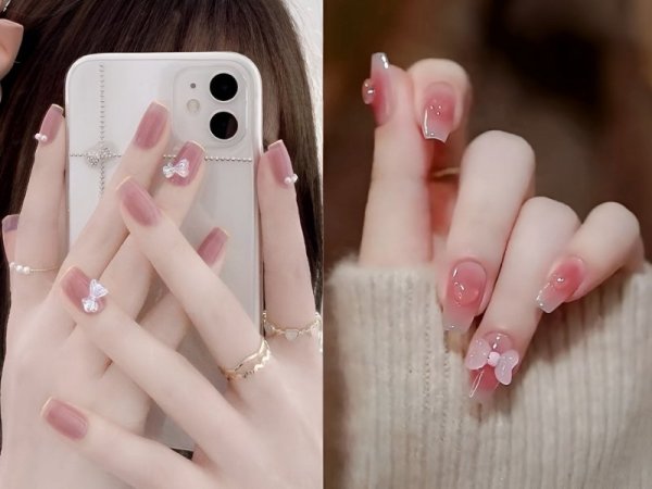 Bạn có thể chọn nơ đúc đặc hoặc nơ trong suốt với các kiểu dáng khác nhau. Bộ móng màu thạch đính nơ sẽ đẹp và thanh thoát nếu bạn gắn charm xen kẽ hoặc gắn trên một ngón tay thay vì hoàn toàn bộ móng.