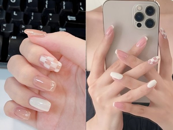 Với mẫu nail sơn thạch đơn giản hình bàn cờ, bạn sẽ dùng sơn gel để tạo các ô vuông bàn cờ, sau đó phết lớp sơn thạch lên để tạo độ trong suốt cho bộ móng. Lưu ý đối với kiểu nail này, các bạn cần sử dụng máy sấy móng sấy lần lượt các lớp sơn gel. Tuyệt đối không sơn đè các lớp gel để đảm bảo họa tiết không vón cục, loang lổ.