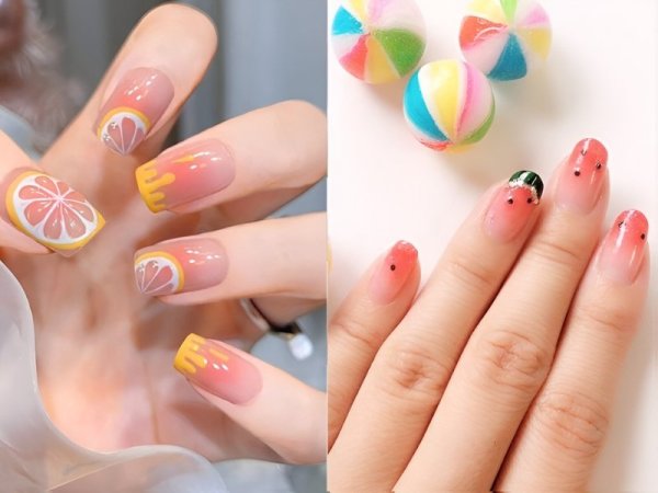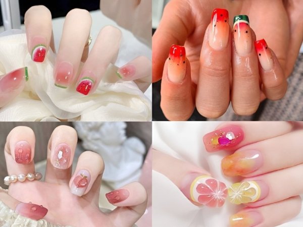 Mẫu nail sơn thạch đơn giản họa tiết trái cây mang đến cảm giác tươi mới (Nguồn: bom.so, @woojeongki136 – Pinterest) Nail sơn thạch trái cây lý tưởng cho những chuyến du lịch sôi nổi (Nguồn:ameblo.jp, petrel.jp)Nail thạch cầu vồng