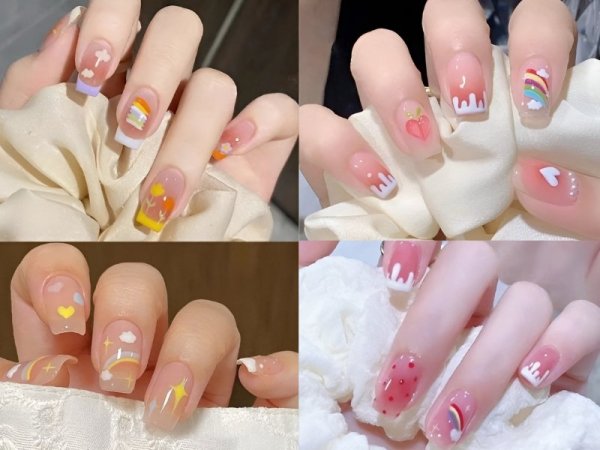 Mẫu nail sơn thạch đơn giản kết hợp với các chi tiết ngộ nghĩnh khác giúp bộ móng rực rỡ hơn (Nguồn:@thquytv – Pinterest, @sumy520 – Pinterest, @linzy2003 – Pinterest, @littlecarrotie – Pinterest)Nail màu thạch hình hoa