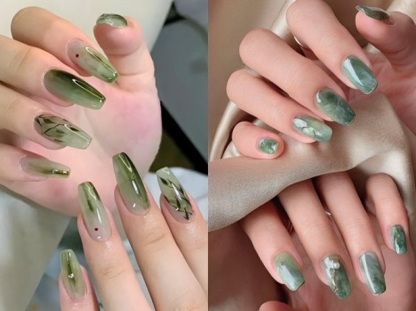 Mẫu nail xanh lá sành điệu. (Nguồn: Azure Cole – Pinterest) Mẫu nail xanh lá sành điệu và hiện đại. (Nguồn: Nouvis – Pinterest)Mẫu nail xanh lá tự nhiên