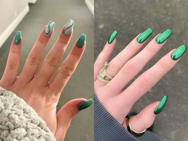 Đây là kiểu nail mang đến sự sang trọng, kiêu sa và lộng lẫy. Với mẫu nail này, bạn có thể sử dụng màu xanh lá đậm chủ đạo kết hợp với các họa tiết và hoa văn tinh tế, hoặc dùng tông màu xanh nhẹ với sơn nhũ lấp lánh nhẹ nhàng. Với mẫu nail xanh lá sang chảnh, bạn sẽ có một bộ móng tay quyến rũ và đảm bảo thu hút mọi ánh nhìn.