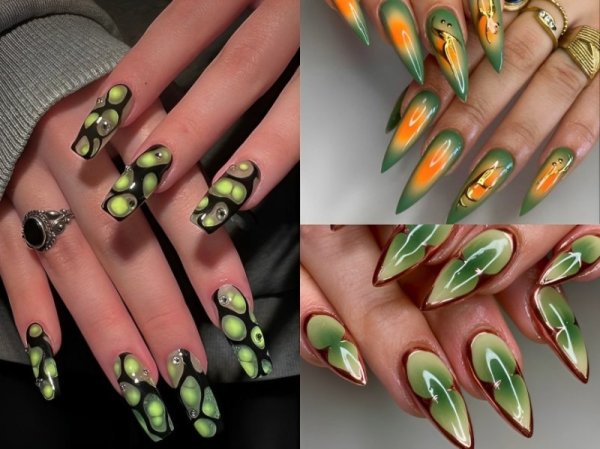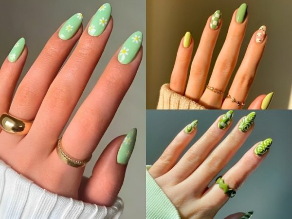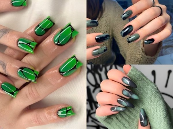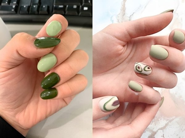 Mẫu nail xanh lá phối hoạ tiết đơn giản. (Nguồn: 𝓐𝓹𝓸𝓵𝓵𝓲𝓷𝓪𝓻𝓲𝓪 – Pinterest) Mẫu nail xanh lá phối hoạ tiết. (Nguồn: 殺人 – Pinterest) Mẫu nail xanh lá phối hoạ tiết bắt mắt. (Nguồn: Nastybaby – Pinterest)Mẫu nail xanh bơ