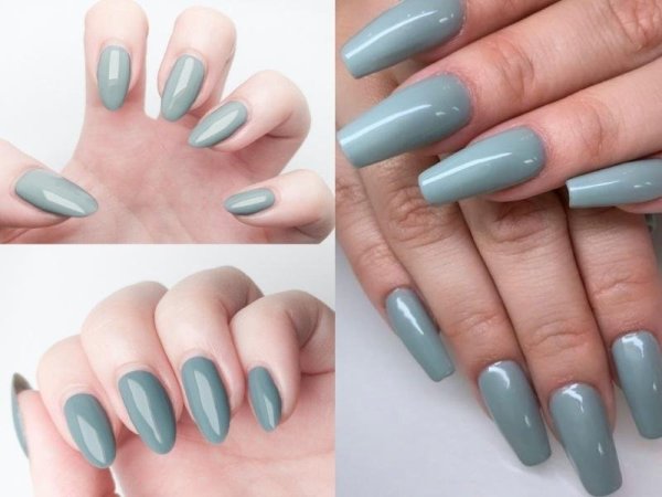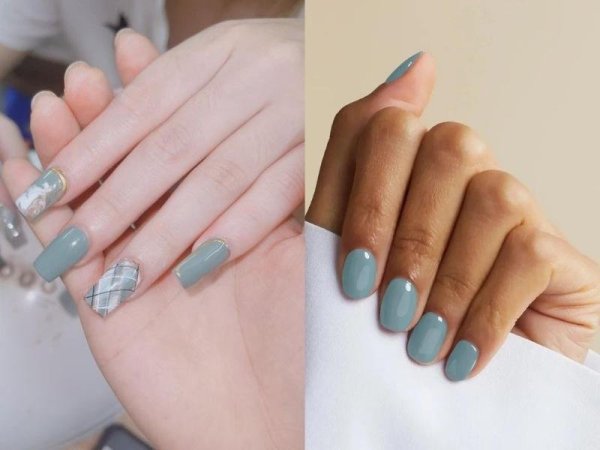 Mẫu nail màu xanh Foggy Blue đơn giản nhưng toát lên vẻ sang trọng (Nguồn: @thuphuong0932656002 – Pinterest, 14daymanicure.com) Nail màu xanh Foggy Blue dễ phối với trang phục sáng màu (Nguồn: lightlacquer.com, dndgel.europe)Nail màu xanh coban