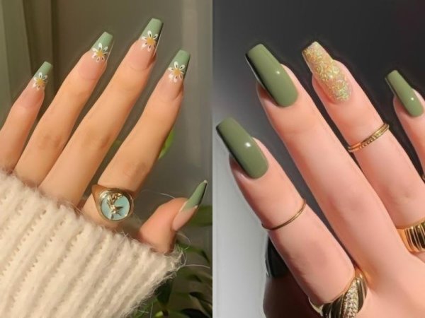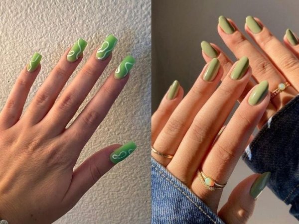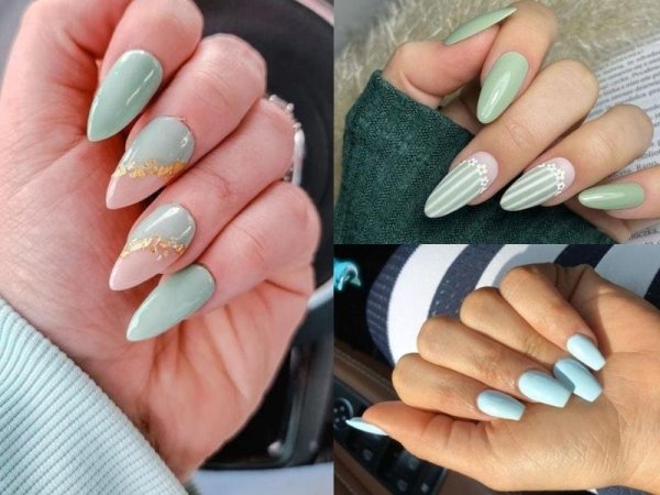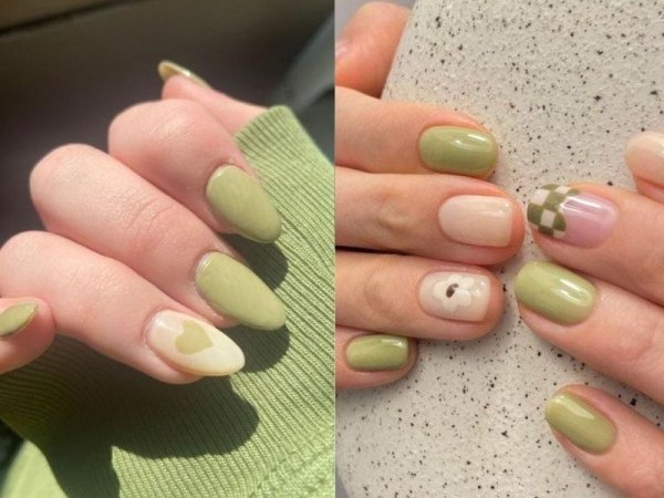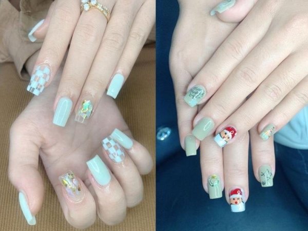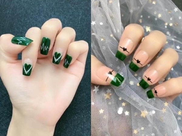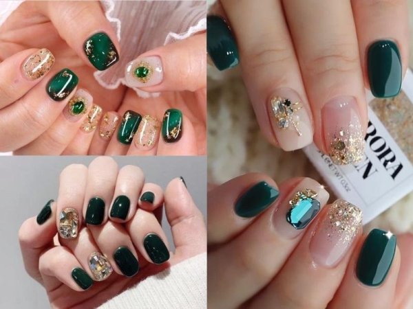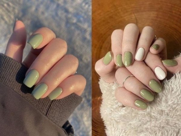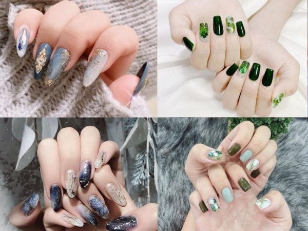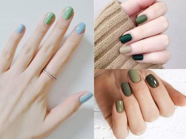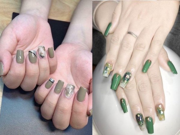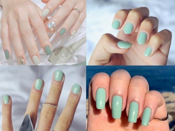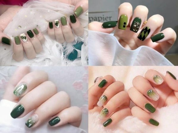 Nail xanh nõn chuối lý tưởng với da sáng nhưng cũng không kén da đen (Nguồn: vienthammydiva.vn, kellypangnail.com, etsy.me, Palace Nails & Spa – Mckinney) Mẫu nail màu xanh nõn chuối đa dạng hơn nhờ phối họa tiết (Nguồn: The Face Holic, Ann Nails)Nail màu xanh rêu đậm