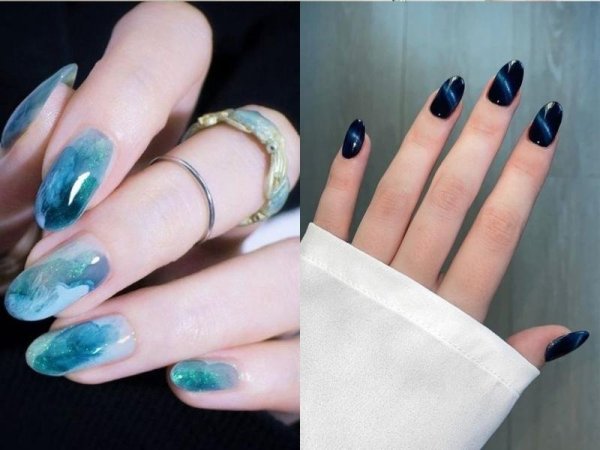 Các mẫu nail màu xanh mang đến cảm giác yên bình, tinh tế (Nguồn: @taehyungv995 – Pinterest, @chikhai2312 – Pinterest)Cách chọn mẫu nail màu xanh phù hợp nhất