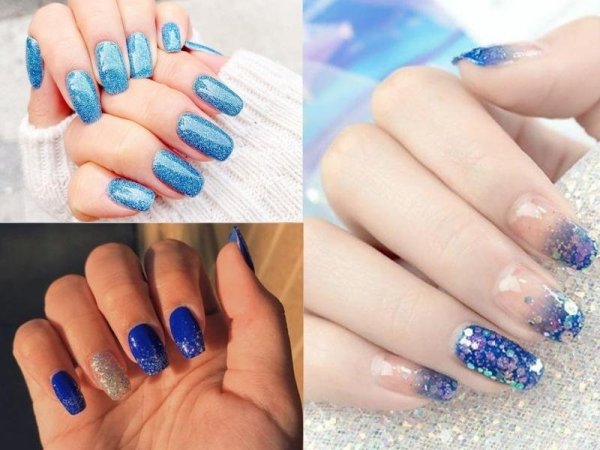 Để tạo cảm giác gợi cảm cho bộ nail màu xanh, các bạn có thể chọn mẫu nail màu xanh phối kim tuyến. Kim tuyến có thể được điểm xuyết ở một vài móng, phối xen kẽ hoặc phủ lên toàn bộ móng. Độ lớn và số lượng kim tuyến cũng tạo ra những hiệu ứng khác nhau. Kim tuyến hạt to thời thượng trong khi kim tuyến hạt nhỏ sẽ lấp lánh hơn.