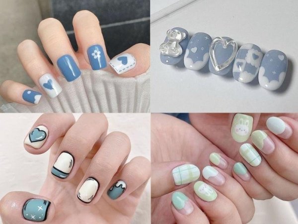 Mẫu nail màu xanh có họa tiết dễ thương, nhí nhảnh dành cho các bạn học sinh, sinh viên hoặc những bạn nữ có tính cách tinh nghịch, yêu đời. Các bạn có thể tự do phối các họa tiết, hình ảnh theo sở thích hoặc theo mùa để có một bộ nail độc đáo, thời thượng.