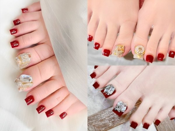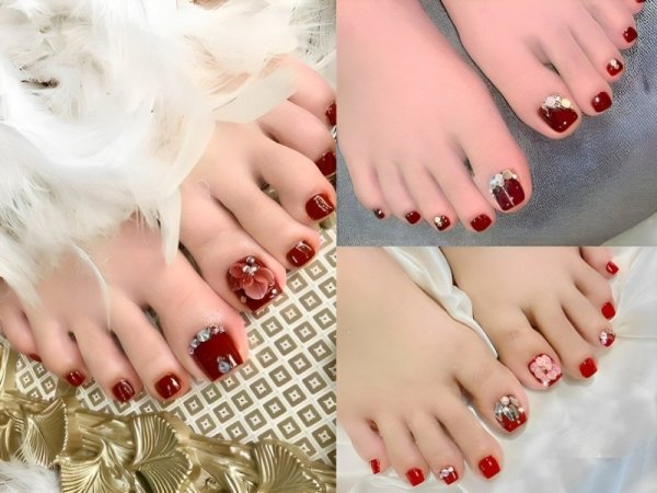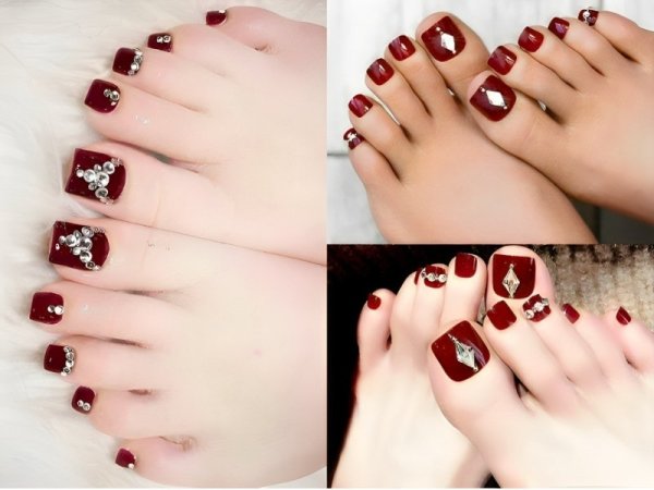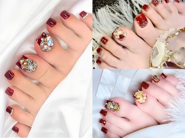 Nail chân màu đỏ rượu đính đá mang đến một vẻ đẹp lộng lẫy và quý phái. Màu sơn màu đỏ rượu làm nền cho các viên đá hoặc hạt cườm đính lên, tạo ra những hiệu ứng sáng bóng và thu hút ánh nhìn. Kiểu nail này cực kỳ thích hợp cho các buổi tiệc đêm, sự kiện đặc biệt hoặc lễ hội. Mẫu nail đỏ rượu đính đá mang đến sự sang trọng và quyền lực cho bất kỳ bạn nữ nào muốn tôn lên vẻ đẹp mạnh mẽ, sang trọng của mình.