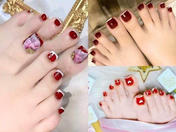 Mẫu nail này tạo ra một vẻ đẹp cổ điển và tinh tế. Sơn móng chân màu đỏ rượu phủ đều trên toàn bộ bề mặt móng và sơn đậm hơn (hoặc sơn trắng) phần đầu móng tạo nên điểm nhấn đẹp mắt. Thiết kế này thích hợp cho những ai yêu thích phong cách truyền thống và muốn tạo dấu ấn cá nhân trong bất kỳ dịp nào, từ đời thường đến các dịp cần diện đồ và chau chuốtchuốc cho ngoại hình.