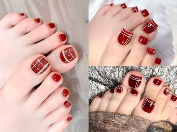Mẫu nail đỏ rượu hoạ tiết độc đáo sẽ giúp bạn tạo ra một điểm nhấn cá nhân nổi bật. Màu đỏ rượu sơn lên cả móng chân kết hợp với các hoạ tiết kẻ, vẽ độc đáo tạo nên điểm nhấn năng động và có phần đáng yêu. Phong cách này phù hợp với những người yêu thích vẻ đẹp năng động và trẻ trung.