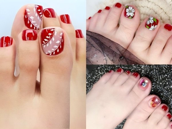 Nail đỏ rượu hoạ tiết hoa. (Nguồn: NaUy – Pinterest) Mẫu nail sơn móng chân màu đỏ rượu hoạ tiết hoa nổi xinh. (Nguồn: Ann Nhi – Pinterest)Mẫu móng chân màu đỏ rượu vang