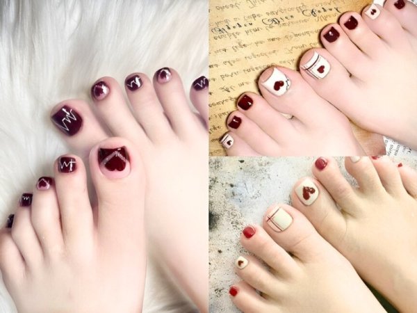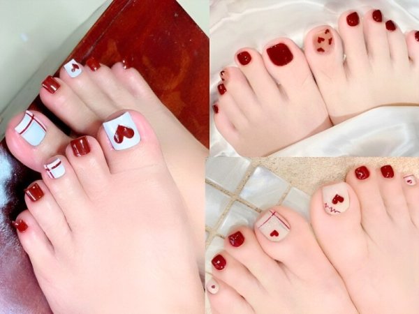 Mẫu nail này tạo nên một vẻ đẹp lãng mạn và khá đáng yêu. Sơn móng chân màu đỏ rượu làm nền cho hoạ tiết trái tim nổi bật lên, tổng thể giúp cho đôi bàn chân của bạn thêm thu hút. Mẫu nail đỏ rượu vẽ trái tim này là lựa chọn hàng đầu của các bạn nữ trẻ trung, năng động và đặc biệt phù hợp cho các bữa hẹn hò lãng mạn.