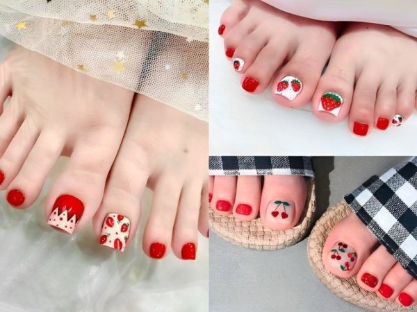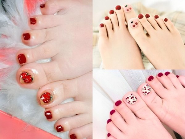 Nail đỏ rượu hoạ tiết mang đến vẻ đẹp tươi trẻ và nữ tính. Sơn móng chân màu đỏ rượu được kết hợp với các họa tiết hoa cherry/dâu tạo nên diện mạo xinh xắn và dễ thương. Phong cách này phù hợp cho những người yêu thích vẻ đẹp nữ tính và muốn tăng thêm sự tươi mới cho đôi chân của mình. Mẫu nail đỏ rượu này thích hợp cho các buổi hẹn hò, dạo phố hoặc các sự kiện không quá đặc biệt.