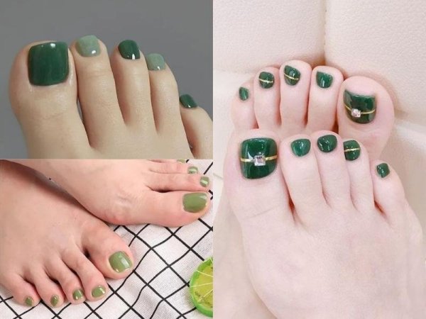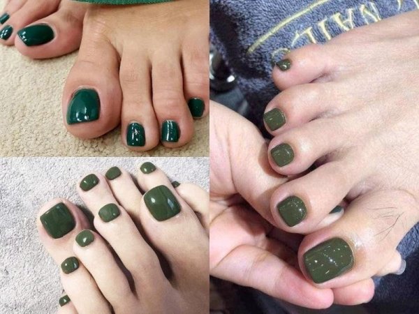 Móng chân màu xanh rêu đậm đính đá hoa (Nguồn: kynguyenlamdep.com) Móng chân màu xanh rêu đậm trơn cho các nàng (Nguồn: vi.alongwalker.co)Móng chân xanh rêu pastel