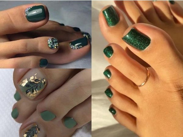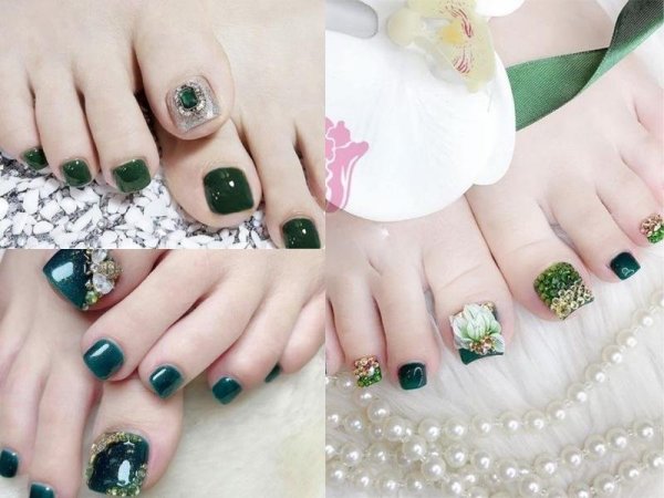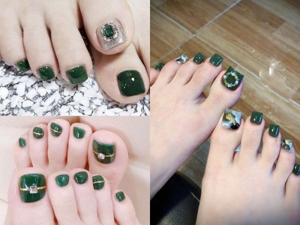 Móng chân màu xanh rêu đậm phù hợp với nhiều tông màu da khác nhau. Màu móng này giúp các nàng làm sáng màu da của mình. Hơn nữa, những mẫu nail xanh rêu đậm đính đá sẽ giúp bạn trông quý phái hơn. Trong các tiệc tối, bạn có thể thêm nhũ vào móng xanh rêu đậm để làm mình nổi bật hơn nhé.